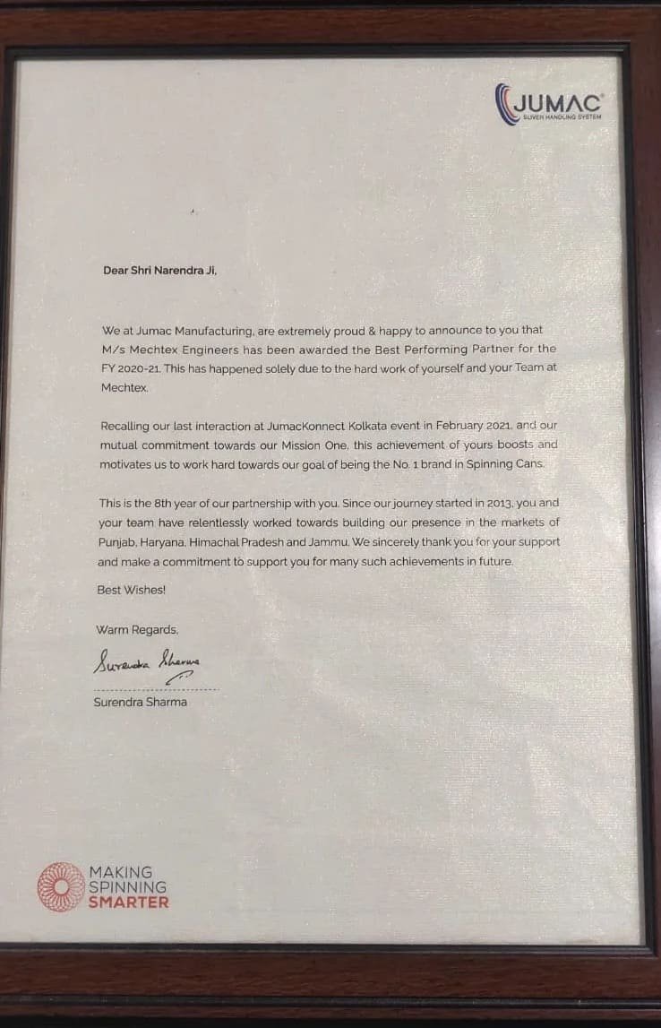 Ever since its inception in 2000 by Mr. Narender Singh, Mechtex Engineers has provided products that are unmatched in quality & performance to various reputed groups of spinning mills. Over the past years, Mechtex Engineers has evolved into a reliable organization & preferred choice for its range of high quality products & active participation of employees & valuable suggestions from our clients.
